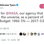 미국 항공 우주국 NASA는 오늘날 천체 물리학 발전을 견인해 온 세계적 기관입니다. 닐 타이슨이 NASA에 들어가는 예산을 늘일 것을 꾸준히 주장해 온 것도 바로 이 때문이겠죠. NASA 공로 훈장을 받기도 했고, 현재 자신이 내다보는 첨단 연구를 실현해 줄 곳 또한 NASA이기에, 타이슨에게 NASA는 특별한 존재입니다. NASA에 대한 타이슨의 말과 생각은 어떤 것들이 있을까요? Funding for @NASA, our agency that explores the universe, as a percent of the US Federal Budget: 1966: 5% — 2017: 0.5%우주를 탐구하는 우리의 기관 NASA에 들어가는 미국 연방 예산 비율: 1966년: 5퍼센트, 2017년: 0.5..