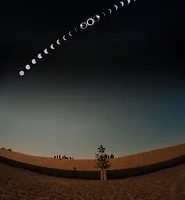 주변의 나뭇가지 사이로 부분식이 진행 중일 때 나타난 일식 그림자이다. 핀홀렌즈 효과로 모든 그림자가 태양의 달에 의해 먹힌 모습을 보여 준다.