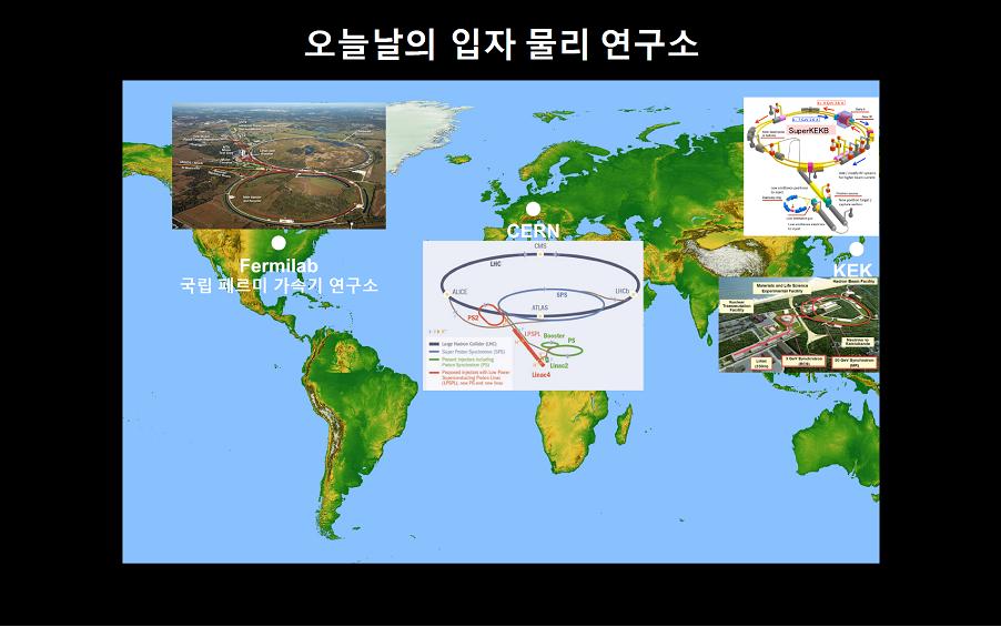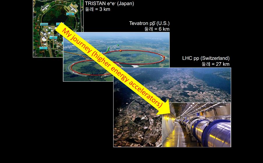 “제 연구 궤적이 이렇습니다. 처음 일본에서 연구를 했을 때는 당시 가장 고에너지 가속기가 그것이었어요. (둘레 3킬로미터) 박사 과정이 끝난 후에는 더 큰 고에너지 가속기가 페르미 연구소에 있어서 그곳으로 가 연구를 했고요. (둘레 6킬로미터) 지금은 가장 큰, 고에너지 가속기가 제네바에 있는 LHC인데요. (둘레 27킬로미터) 에너지가 더 높은 가속기를 따라서 연구를 했습니다.”