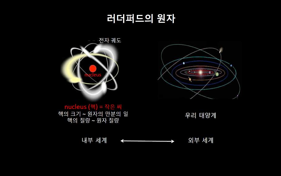 김영기 교수님은 여기서 가장 작은 알맹이와 우주가 유사한 구조를 갖고 있음을 보여 주었습니다. 내부 세계와 외부 세계가 겹쳐지는 순간입니다.