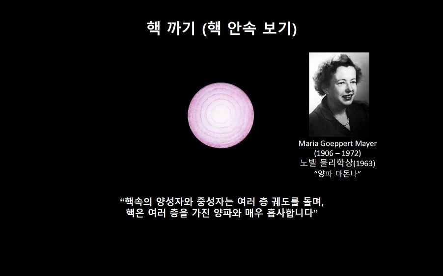 “마리아 메이어는 “핵 속의 양성자와 중성자는 여러 층 궤도를 돌며, 핵은 여러 층을 가진 양파와 매우 흡사하다.”라고 말을 해서 별명이 ‘양파 마돈나’예요. 시카고 대학교 교수이기도 했는데요. 제가 현재 시카고 대학교 물리학과 학과장예요. 여기서 마리아 메이어의 업적을 기리기 위해 물리학과 안에 전시도 만들고, 그의 이름을 딴 강당도 만들었습니다. 언젠가 시카고 대학교에 오시면 한 번 방문해 보세요.”