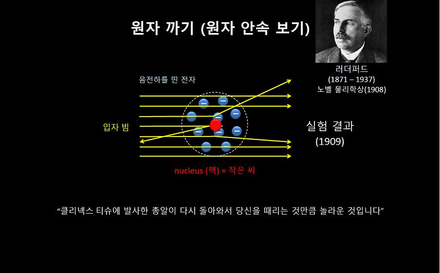 “만약 톰슨 모델이 맞다면 알파 입자 빔은 원자를 그대로 통과했을 거예요. 워낙 양전하는 푸석하고, 전자는 아주 작으니까요. 그런데 실험을 해 보니 아니었습니다. 대부분의 알파 입자 빔은 원자를 통과하지만 간혹 튕겨 나오기도 했어요. 이것은 대단히 놀라운 사실이었습니다. 러더퍼드는 “크리넥스 티슈에 발사한 총알이 다시 돌아와서 당신을 때리는 것만큼 놀라운 것”이라고까지 말을 했거든요. 당시의 놀라움을 짐작할 수 있겠죠.”