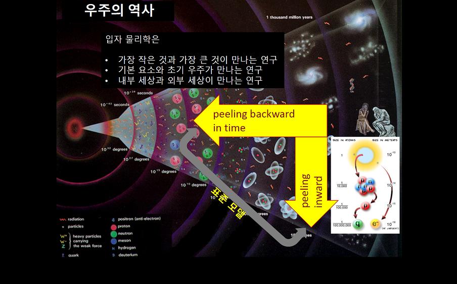 우주 초기에 존재했을 입자들이 발견되면서 과학자들은 이론을 완성해 가고 있습니다. 김영기 교수님은 ‘표준 모형’을 위해서는 가장 작은 알맹이를 찾아 나가는 노력과 우주 초기 입자들을 발견하는 노력이 모두 필요하다는 점을 강조했습니다.