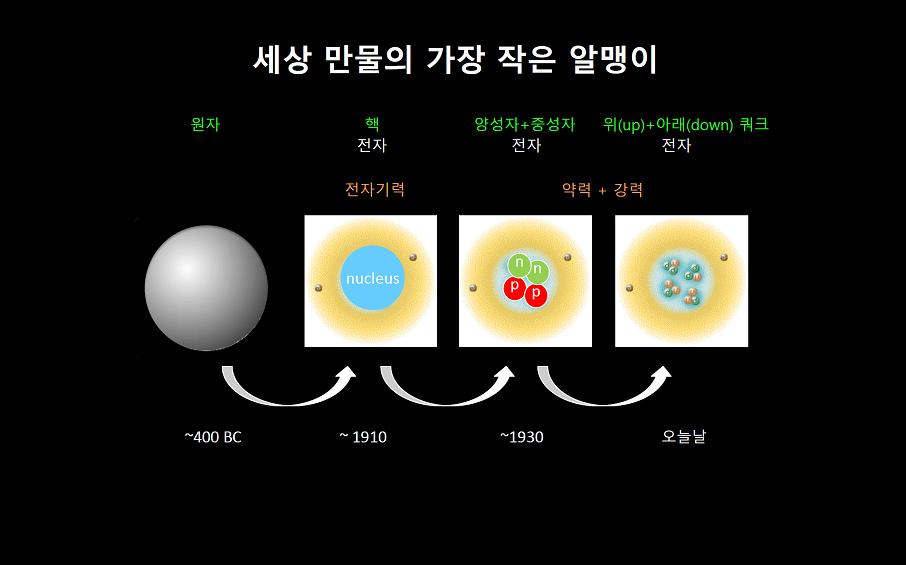 “지금까지 이야기한 것을 정리해 보면 가장 작은 알맹이가 우리를 만들었을 것이라는 개념은 2,500년 전이나 지금이나 같습니다. 다만 우리가 알게 된 지식 수준이 달라진 것이죠. 처음에는 원자를 가장 작은 알맹이로 생각했다가 1910년대에 원자가 핵과 전자로 만들어져 있다는 것을 알게 됐고요. 불과 20년 후인 1930년대에는 핵이 다시 그보다 훨씬 작은 양성자와 중성자로 만들어져 있다는 것을 알게 됐습니다. 지금은 양성자와 중성자가 더 작은 알맹이, 업 쿼크와 다운 쿼크로 만들어져 있다고 알고 있죠.”