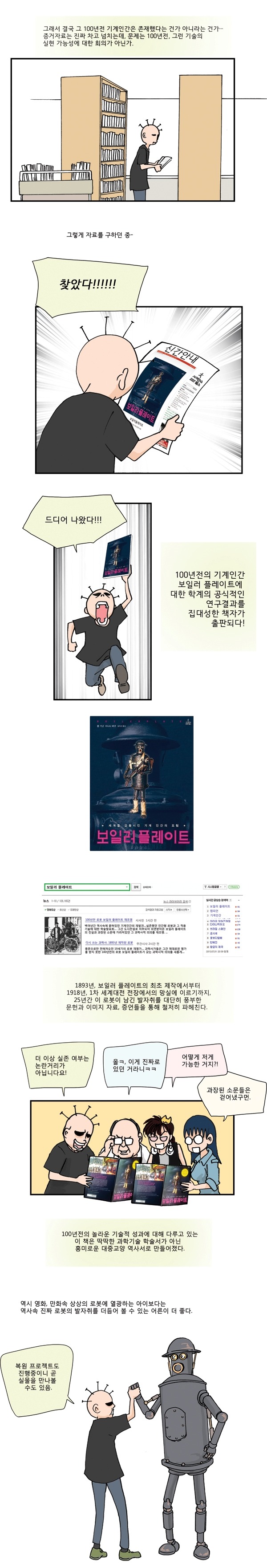 로봇의 활약을 통해 세계 근현대사를 살펴보며, 인류 역사와 인간의 가치에 대한 생각거리를 던져주는 SF 소설 『보일러플레이트』를 소개합니다. 『보일러플레이트』는 로봇이라는 단어가 등장하기도 전인 19세기 말에 '로봇 병사'가 존재했다는 발상으로부터 시작된 이야기로, 가상의 깡통 로봇 보일러플레이트가 격변의 19세기 말과 20세기 초를 종횡무진하며 실제 세계사의 이정표가 되는 순간마다 중요한 역할을 수행했다는 가상의 스토리를 담고 있는 작품입니다. 근현대사와 과학을 모두 아우르면서도 가슴 따뜻한 SF 소설을 읽고 싶으신 분들께 추천드립니다. 『보일러플레이트』 내용이 궁금하신 분들을 위해 출간 당시 굽시니스트에서 그린 만화를 다시 한 번 소개합니다.