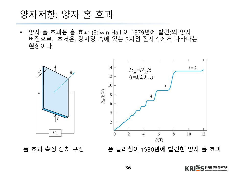 조셉슨 효과가 양자 전압을 해결했다면 양자 홀 효과는 양자 저항을 해결해 줍니다. 이호성 박사님은 이를 “홀 효과의 양자 버전”이라고 말하며 “아주 낮은 온도, 아주 높은 자장의 세기에서 저항값 자체가 양자화된다.”라고 설명했습니다.