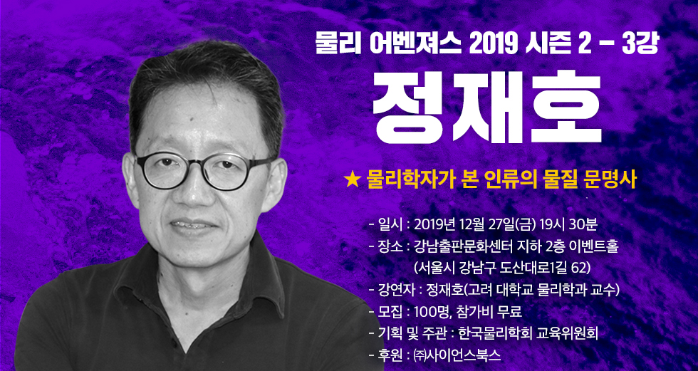 「물리 어벤져스 2019 시즌2」 3강 "물리학자가 본 인류의 물질 문명사"가 12월 27일 금요일 저녁 7시 30분에 ‘강남출판문화센터 지하 2층 이벤트홀’에서 진행됩니다.