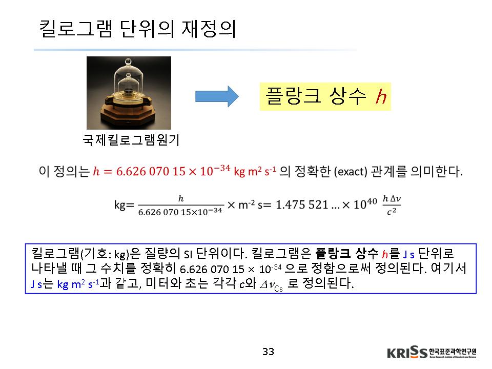 이호성 박사님은 플랑크 상수 h의 값이 “6.62607015×10⁻³⁴J s”로 고정되었다고 설명했습니다. “중요한 것은 불확도 없는 플랑크 상수 h 값이 고정되었다는 점으로, 여기서 킬로그램을 유도해 낸다.”라고 말했습니다.