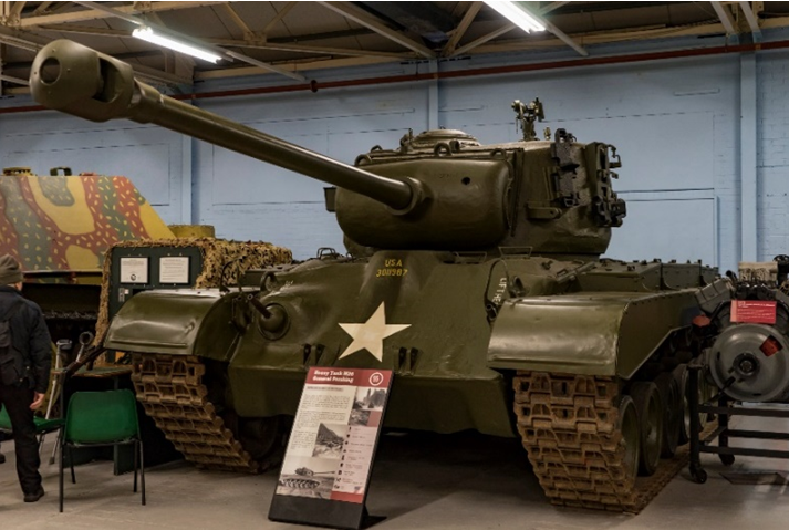 미국의 실질적인 최초의 중전차 퍼싱(Pershing)입니다. 개발과 실전 투입이 매우 늦어져 전쟁 막바지가 되어서야 유럽 전선에 투입될 수 있었습니다. 당시 미 육군은 ‘구축 전차 독트린’이라는 사상을 가지고 있었습니다. 전차는 보병을 지원하고 전차는 구축전차로 잡는다는 논리였습니다만 실전은 이상대로 흘러가지 않았습니다. 결국 대전차 화력이 부족한 셔먼이 일선에서 독일 중전차와 맞서야 했고 중대한 피해를 입었습니다. 그제서야 문제의 심각성을 깨달은 수뇌부는 급하게 퍼싱의 개발을 마치고 유럽전선에 투입했습니다. 퍼싱의 90밀리미터 주포와 육중한 장갑으로 판터와 티거를 상대할 수 있었지만 이미 때는 너무 늦었습니다.