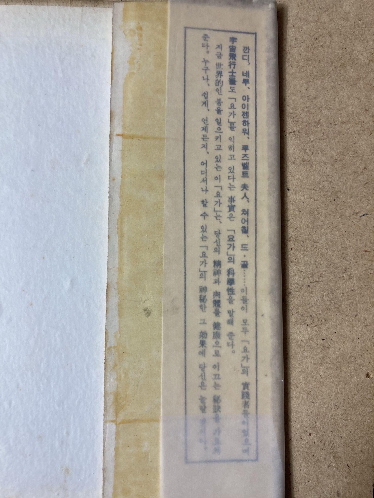 “간디, 네루, 아이젠하워, 루스벨트 부인, 처칠, 드골…… 이들이 모두 ‘요가’의 실천자들이었으며 우주 비행사들도 ‘요가’를 익히고 있다는 사실은 ‘요가’의 과학성을 말해 준다. 지금 세계적인 붐을 일으키고 있는 이 ‘요가’는, 당신의 정신과 육체를 건강으로 이끄는 비결을 가르쳐준다. 누구나, 쉽게, 언제든지, 어디서나 할 수 있는 ‘요가’의 신비한 그 효과에 당신은 놀랄 것이다.”