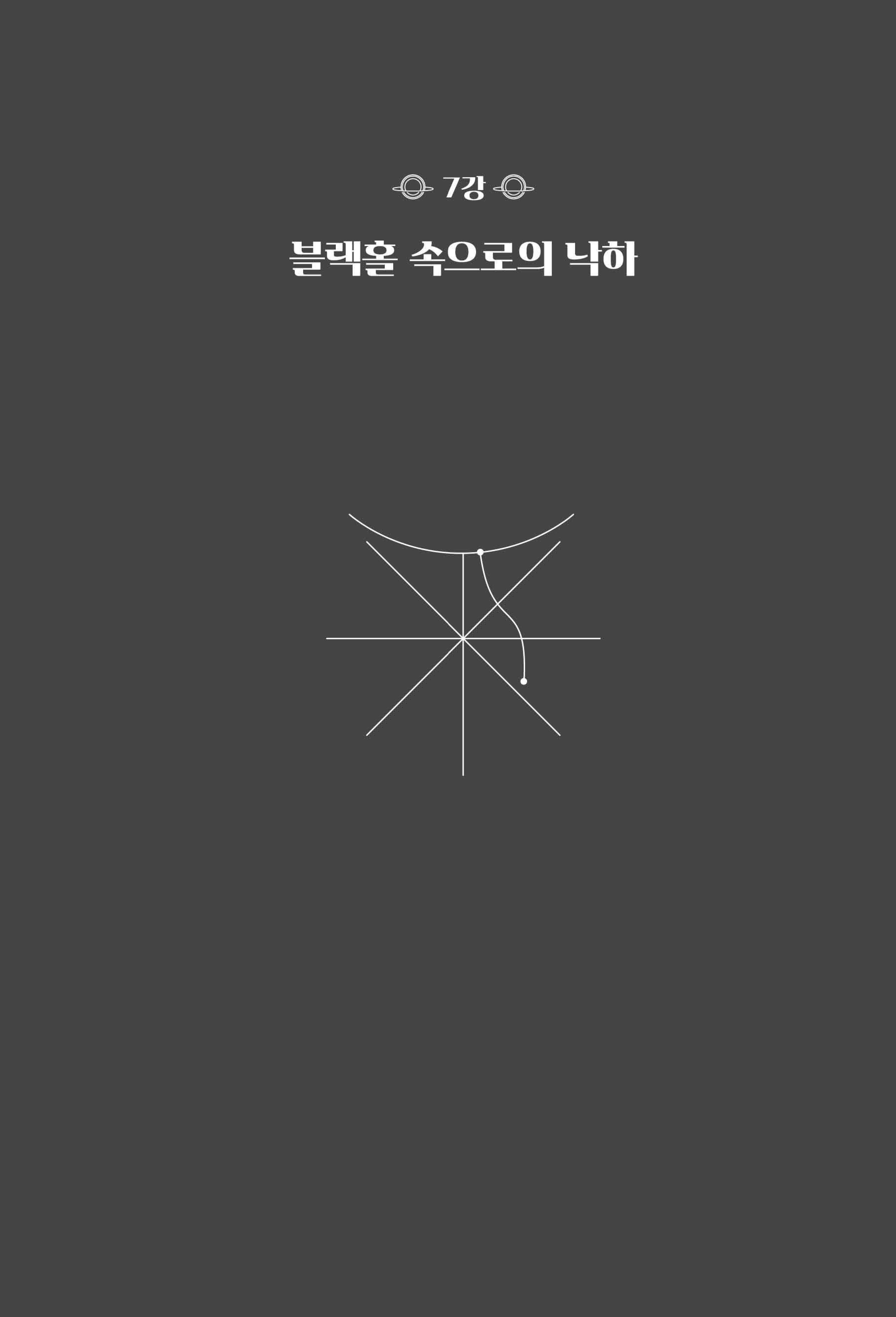 7강 「블랙홀 속으로의 낙하」에서 서스킨드 교수는 블랙홀 주변에서, 지평선 바깥에서, 지평선에서, 블랙홀 안쪽에서, 그리고 특이점에서 무슨 일이 일어나는지를 복습하며 블랙홀 물리학에 대한 심도 있는 논의를 이어 갑니다. 그는 슈바르츠실트 계측으로 시작한 다음 좌표 변환을 적용해 대형 블랙홀의 사건의 지평선 근처에서 시공간이 거의 평평하다는 사실을 증명합니다. 즉 블랙홀을 향해 떨어지는 관측자에게 사건의 지평선에서는 특별한 일이 일어나지 않습니다. 그다음 서스킨드 교수는 쌍곡선 좌표가 있는 시공간 도표를 사용해 사건 지평선을 지나 블랙홀 속으로 낙하하는 관측자의 물리학을 설명합니다. 강의 마지막 「질의 응답 시간」에서 학생들은 2개의 블랙홀, 회전하는 블랙홀, 증발하는 블랙홀까지 많은 질문을 던지며 블랙홀의 특이한 특성을 탐구합니다.