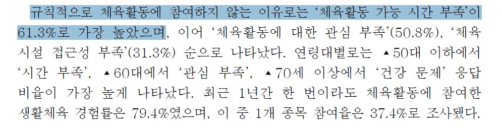 운동을 하는 사람들의 비율은 전체적으로 증가했지만, 규칙적으로 운동하지 않는 이유 1위는 여전히 “체육 활동 가능 시간 부족(61.3퍼센트)”이었습니다. 즉 이번 「2025 국민 생활 체육 조사」가 보여 주는 메시지는 굉장히 현실적이라고 할 수 있습니다.