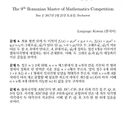 국제 수학 올림피아드 상위권 국가들만 따로 모여 더 어려운 문제로 수학 실력을 겨루는 제9회 루마니아 수학 마스터 대회 2017이 오는 2월 22-27일에 루마니아 수도 부쿠레슈티에서 열립니다. 한국에서는 모두 4명의 중고등학생들이 대표로 참가할 예정입니다.